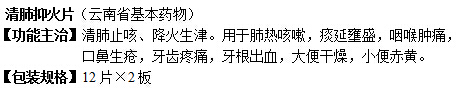 用于肺熱咳嗽,痰延壅盛,咽喉腫痛,口鼻生瘡,牙齒疼痛,牙根出血,大便干燥,小便赤黃。