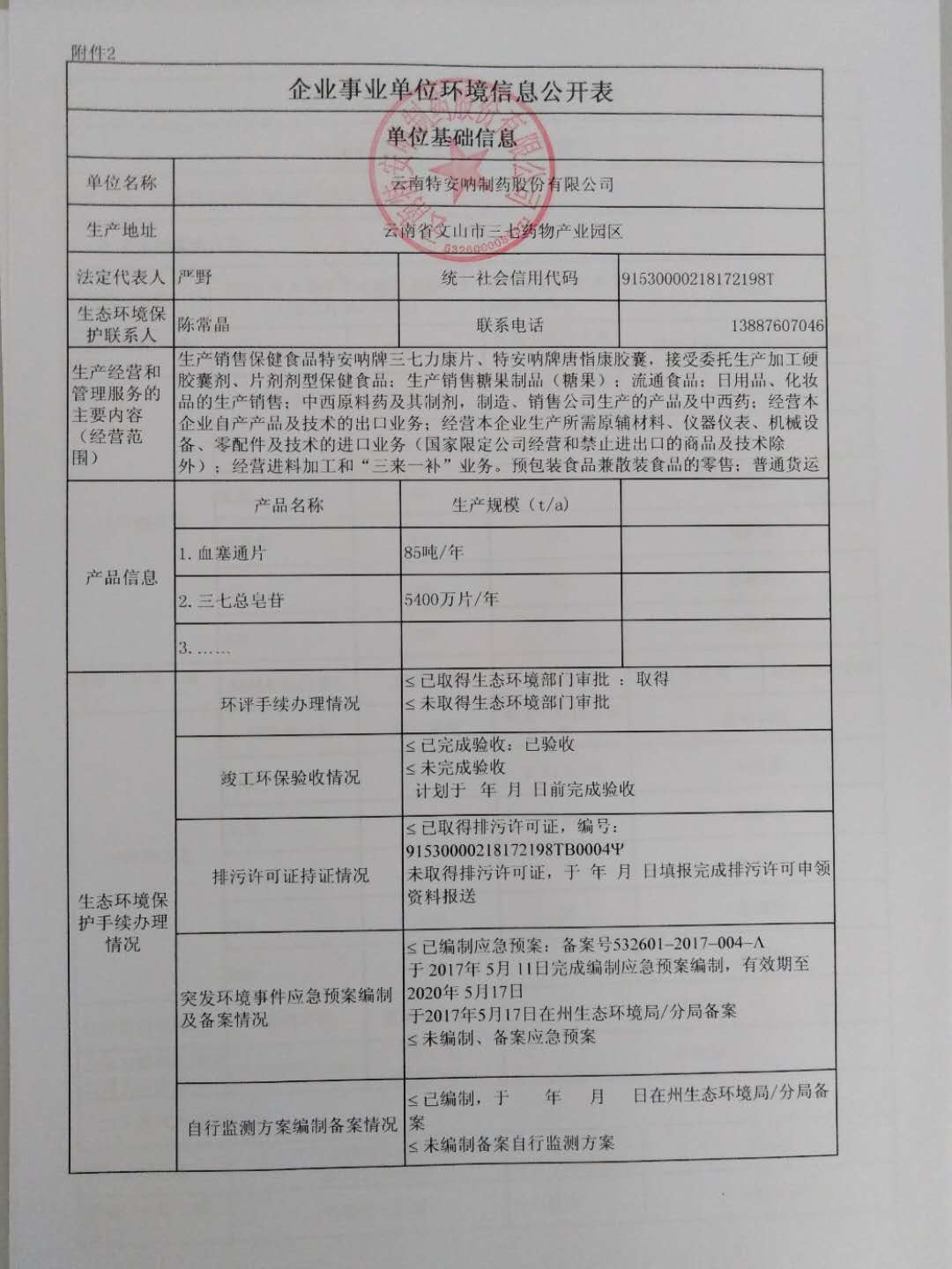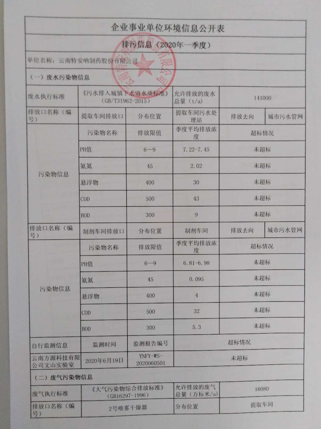云南特安吶制藥股份有限公司2020上半年環(huán)境信息公開(kāi)