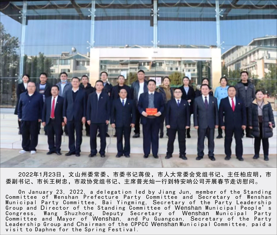 2022年1月23日,文山州委常委、市委書記蔣俊,市人大常委會黨組書記、主任柏應明,市委副書記、市長王樹忠,市政協黨組書記、主席普光燦一行到特安吶公司開展春節(jié)走訪慰問。