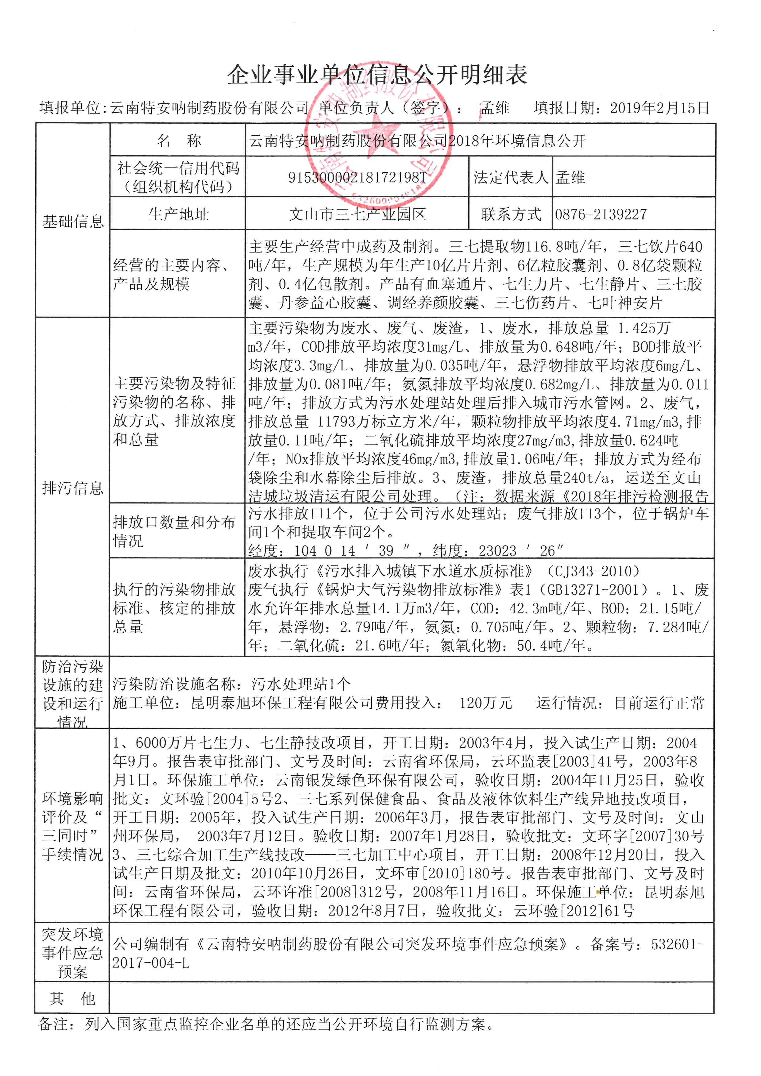 2019年云南特安吶制藥股份有限公司環(huán)境信息公開