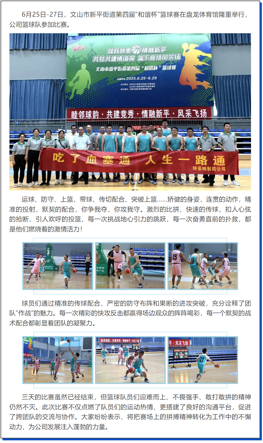 6月25日-27日,文山市新平街道第四屆“和諧杯”籃球賽在盤龍體育館隆重舉行,公司籃球隊參加比賽。